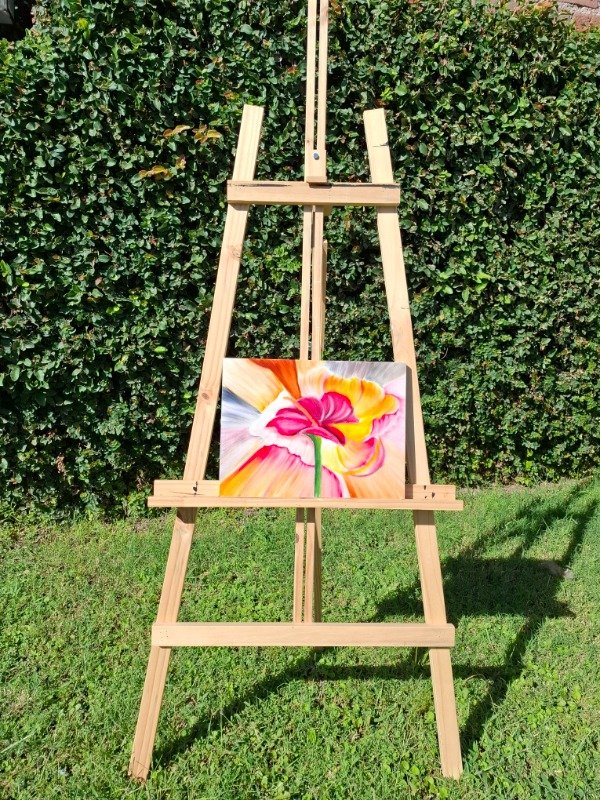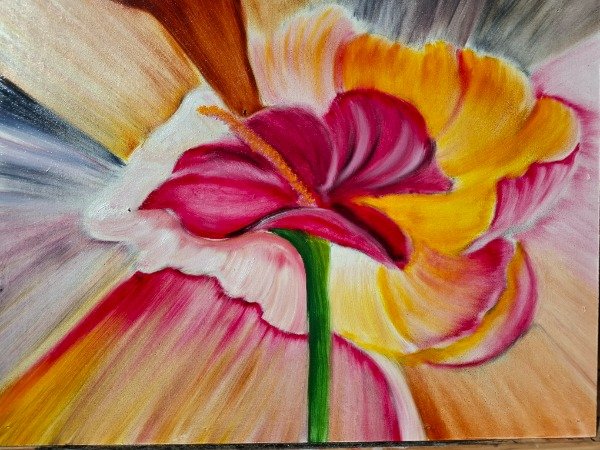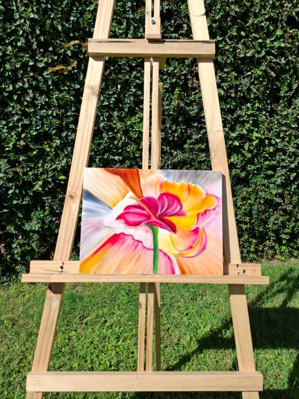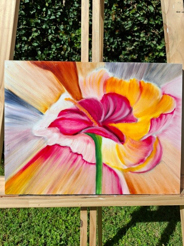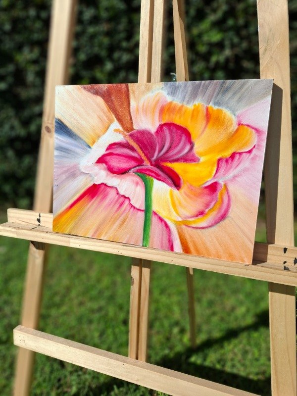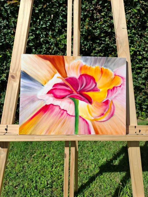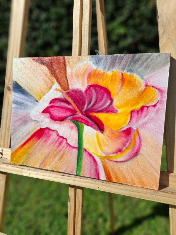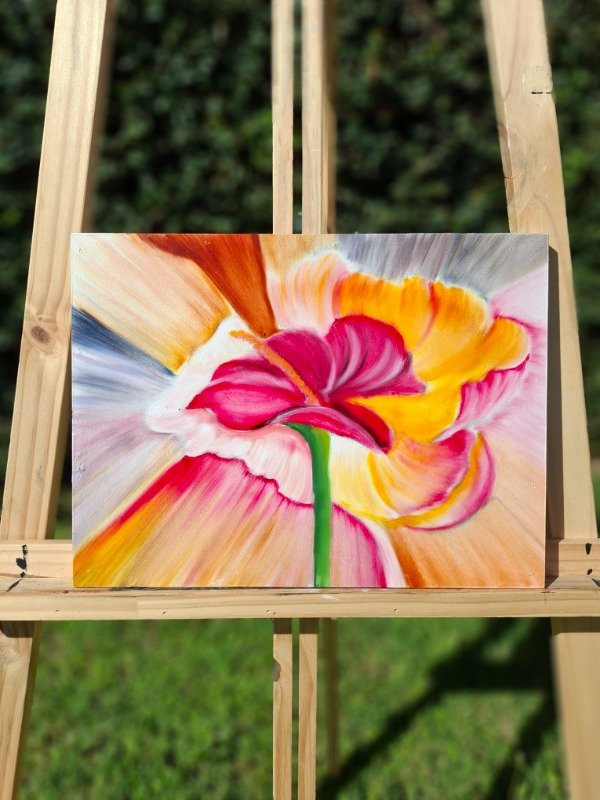 El óleo se funde en una explosión de color que envuelve la flor y la convierte en un punto de luz vibrante. Una pieza llena de movimiento, ideal para dar vida a cualquier espacio.
