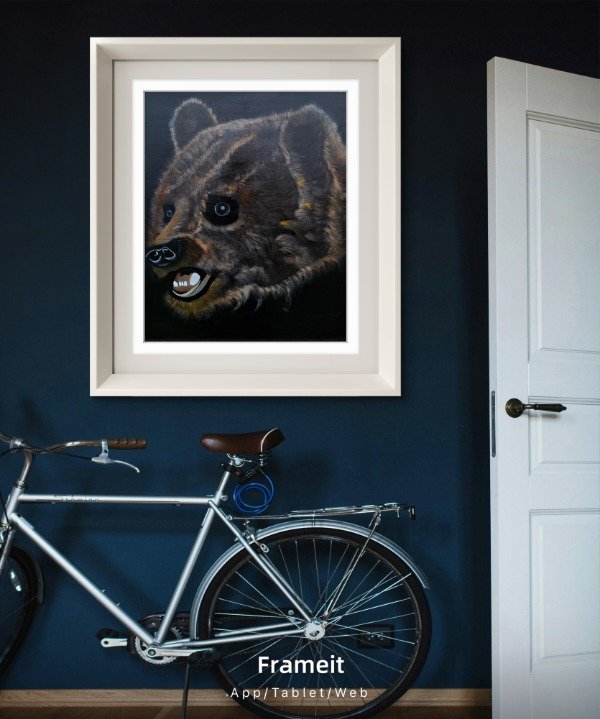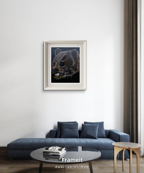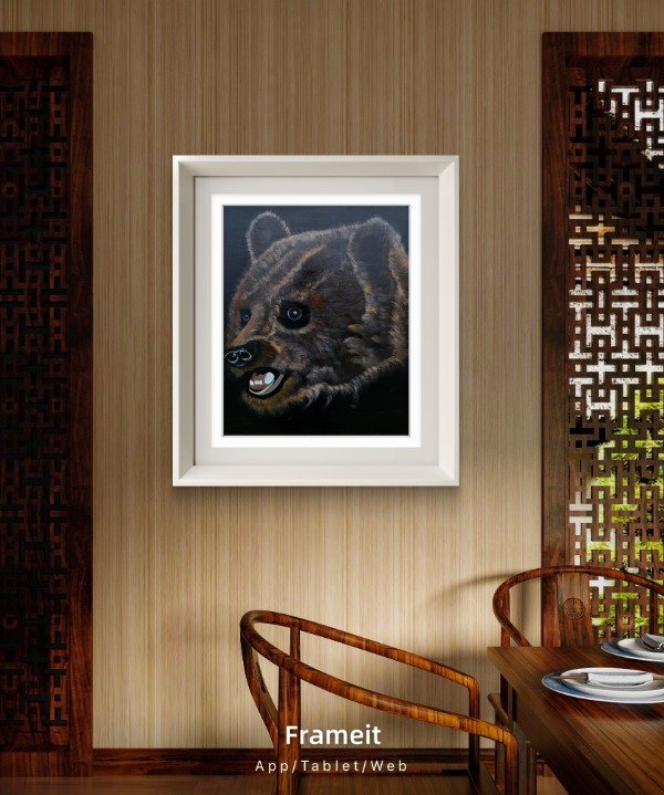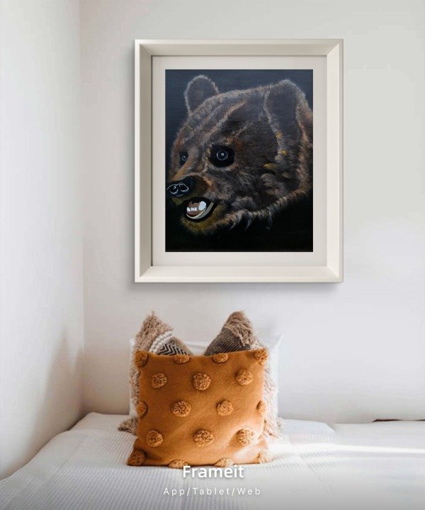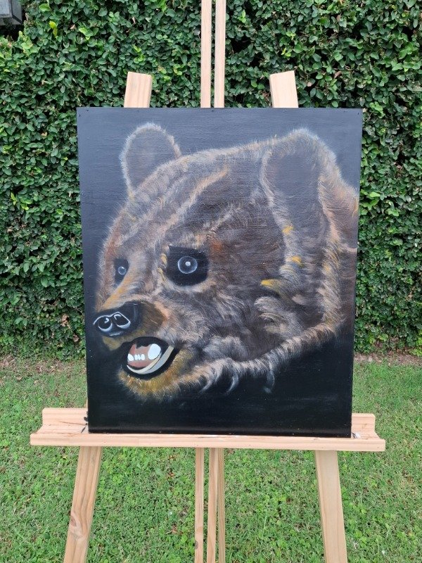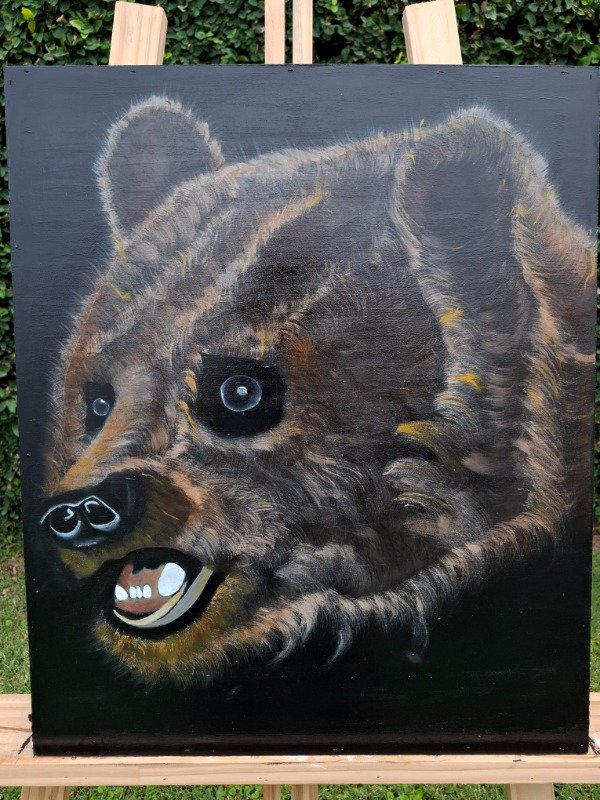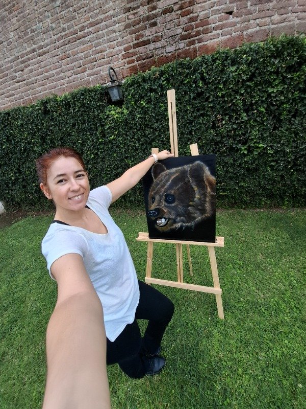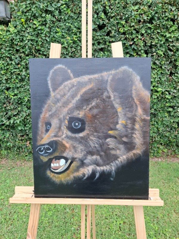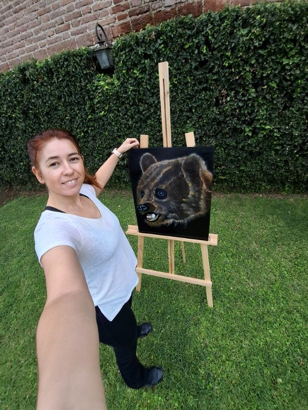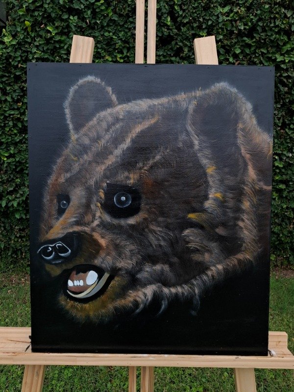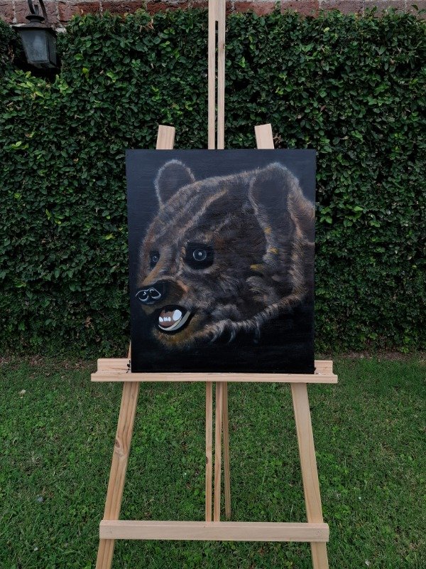 Cada capa de acrílico y óleo construyó profundidad, volumen y textura en el pelaje, logrando una presencia imponente y a la vez sensible.