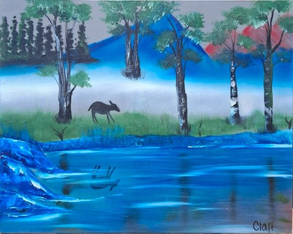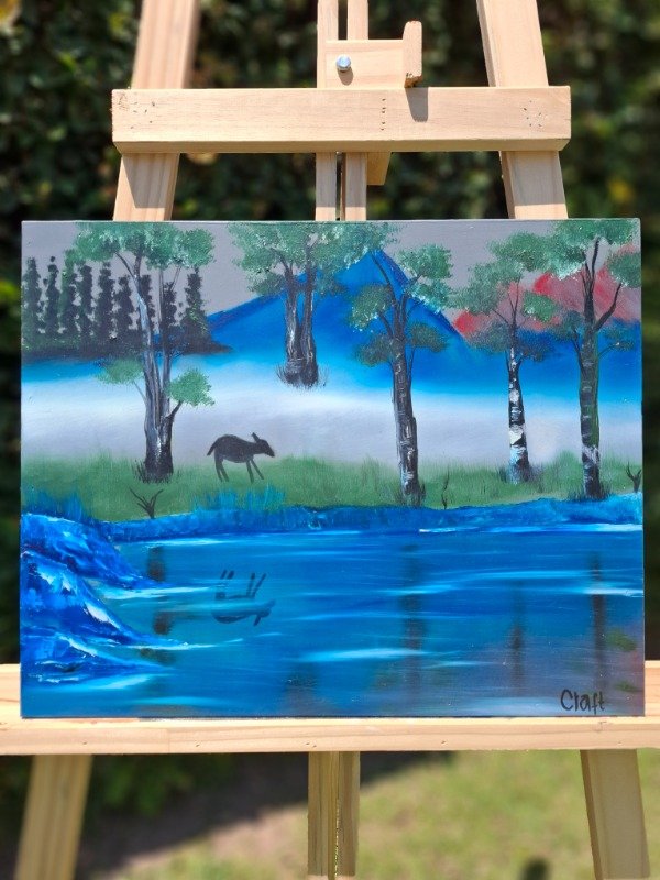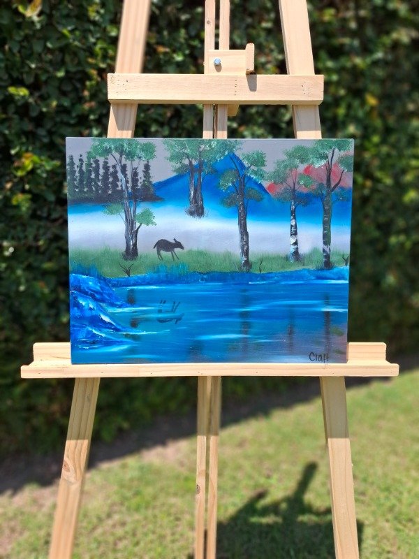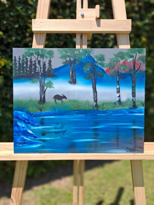 Esta obra captura la magia de un paisaje donde las montañas, con tonos azules y rojizos, se reflejan en aguas cristalinas, creando un escenario de tranquilidad y belleza natural. Cada detalle de la vegetación y los colores transmite paz, transportándote a un lugar de armonía con la naturaleza.