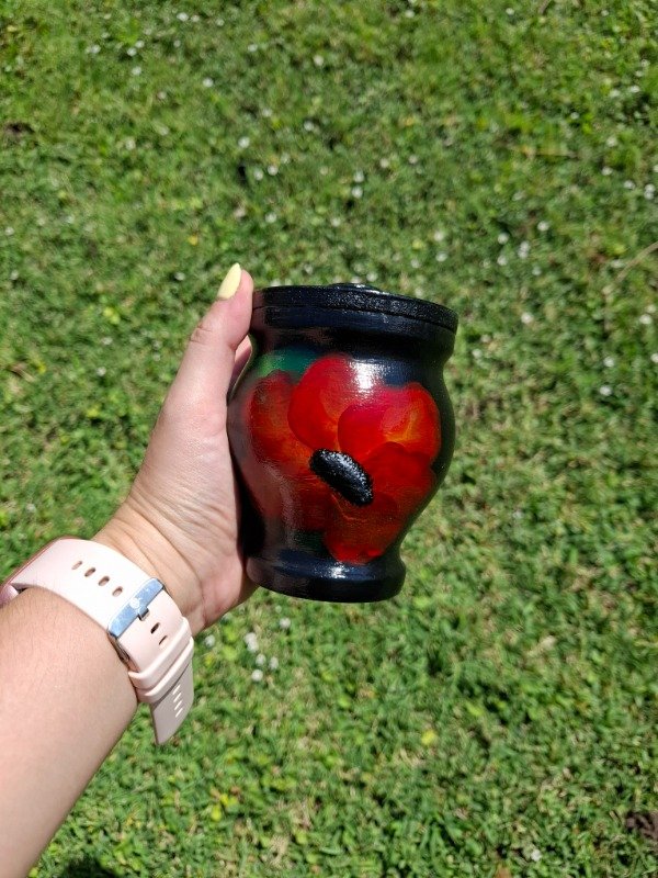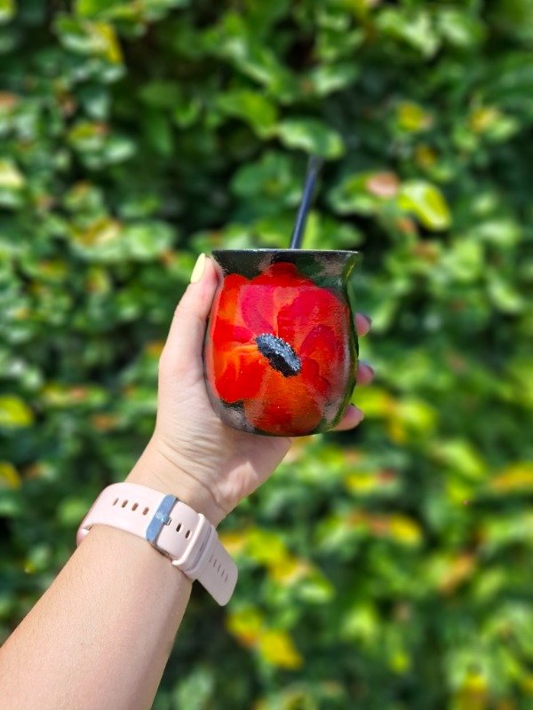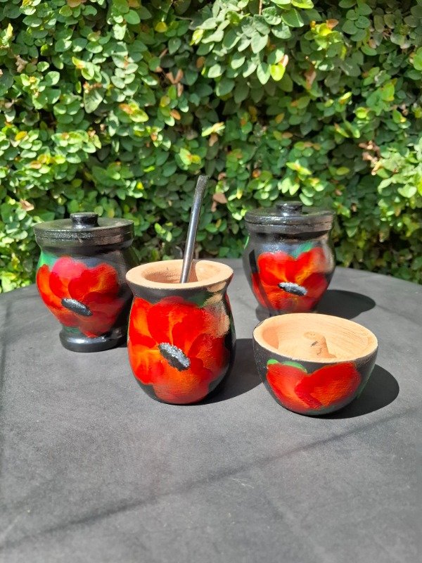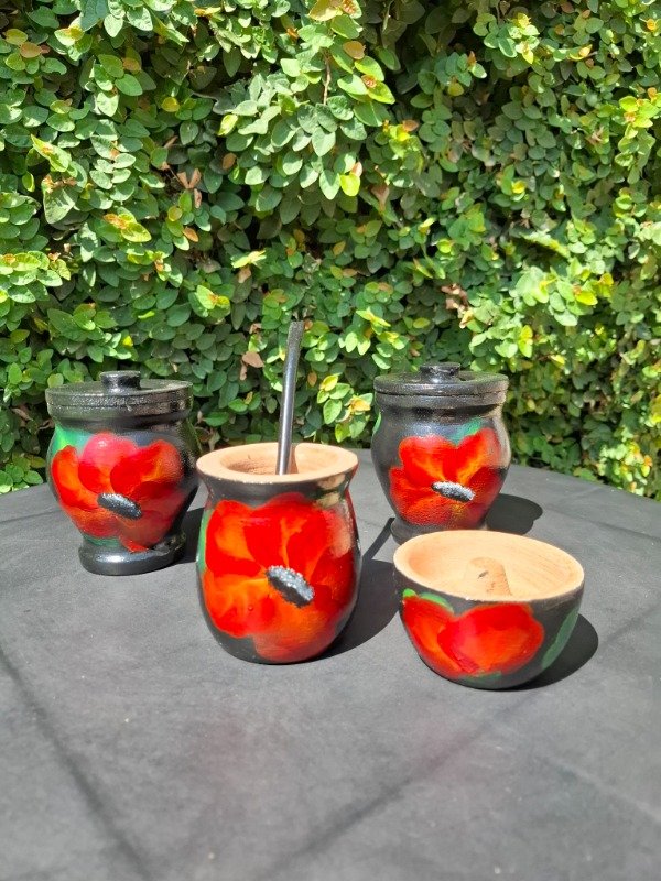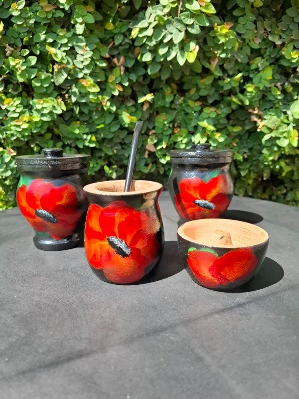 Set completo de algarrobo, compuesto por yerbera + azucarera + mate + bombilla + portasahumerio con diseño Floral, Amapola.
