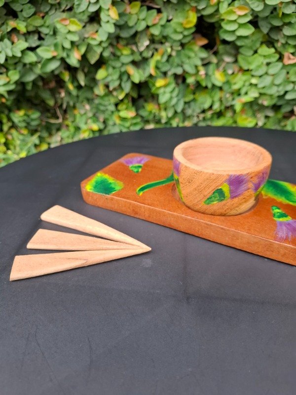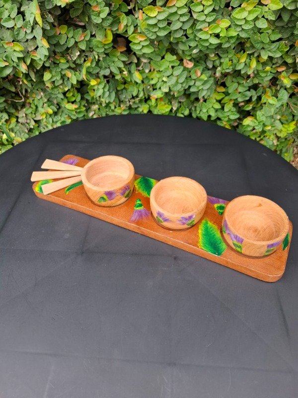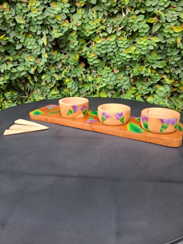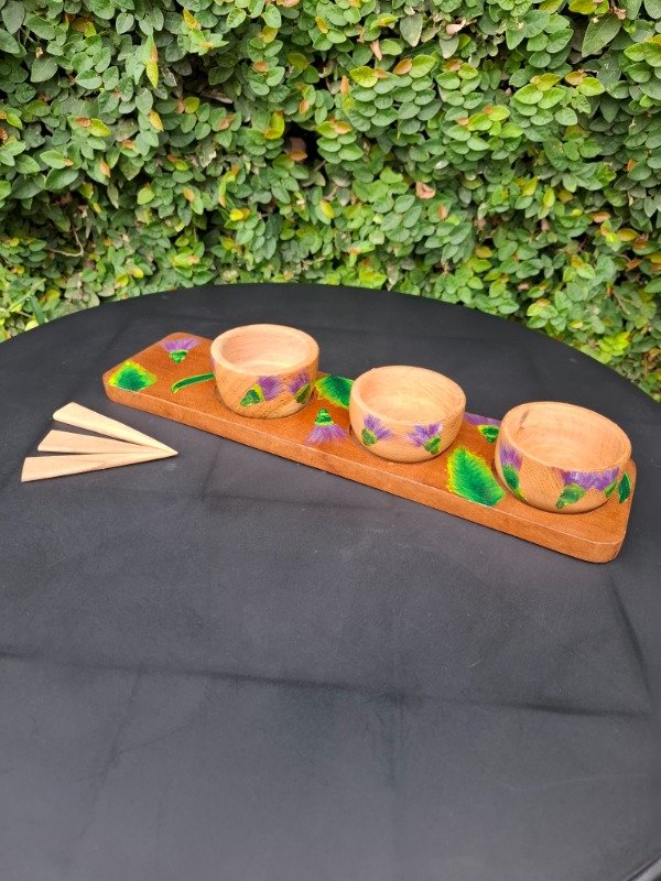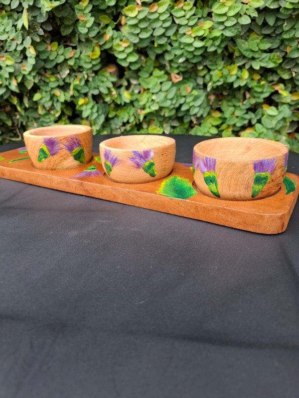 Set de 3 cuencos, 3 pinches y una tabla de algarrobo con 3 cavidades, ideal para picadas, con diseño Floral Cardo. Producto único, artesanal, pintado a mano.